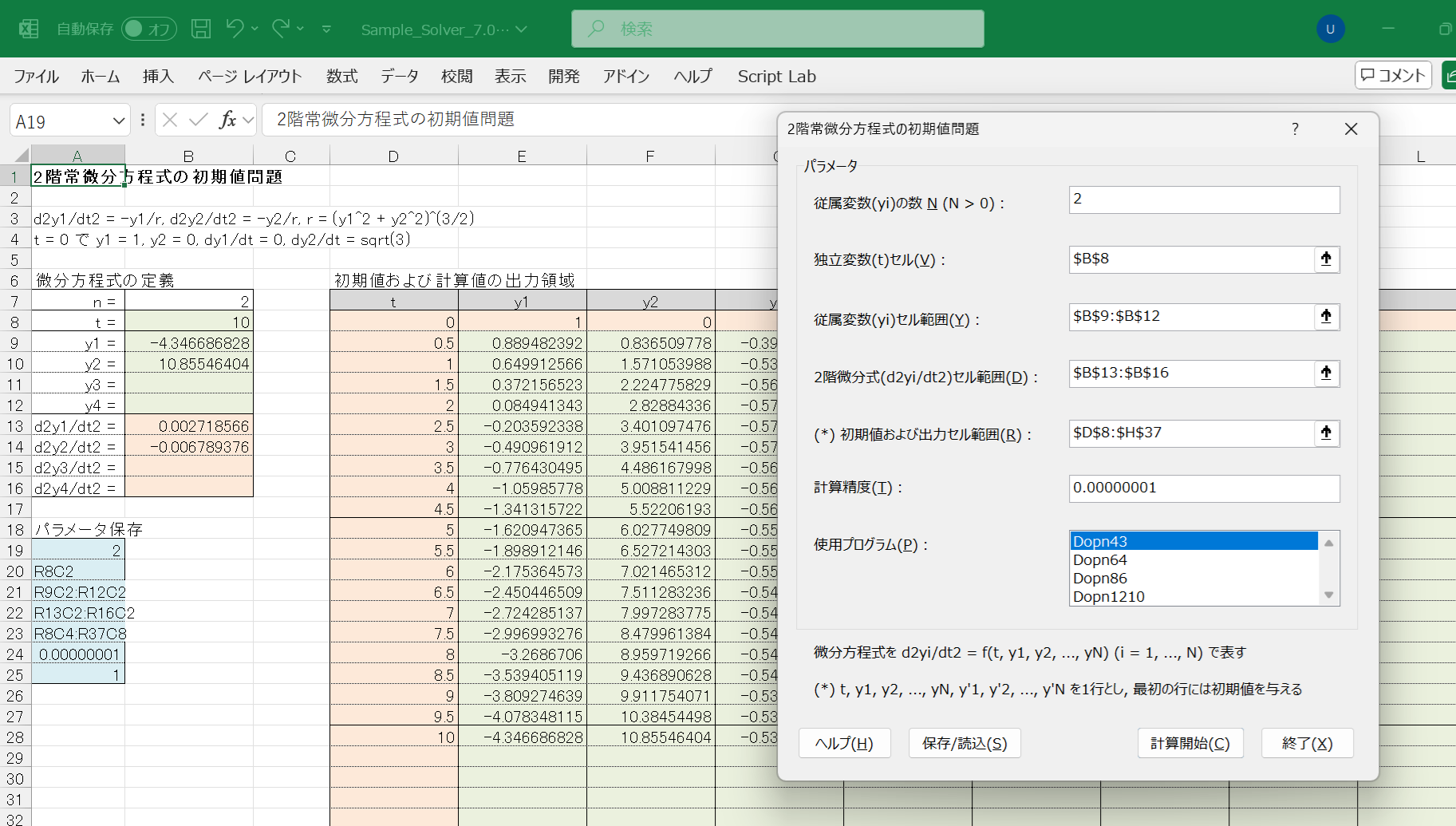 初期値および出力セル範囲(この場合D8:H28)の各行の1列目にtを入力します. 1行目には初期値(この場合 t0, t0におけるy1, y2, dy1/dt, dy2/dt)を入力しておきます.「計算開始」をクリックすると, 各行のtにおけるy1, y2, dy1/dt, dy2/dtを求め2列目以降に出力します. 指定した範囲内であってもtが空白の行に出会うと計算を終了します.