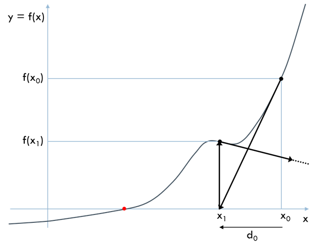 \(x_0\) から始めてその点における接線が \(x\) 軸と交わる点を \(x_1\) とします. 微分値 \(f'(x_0)\) は接線の傾きを表すので, それを使って交点 \(x_1\) を求めることができます.