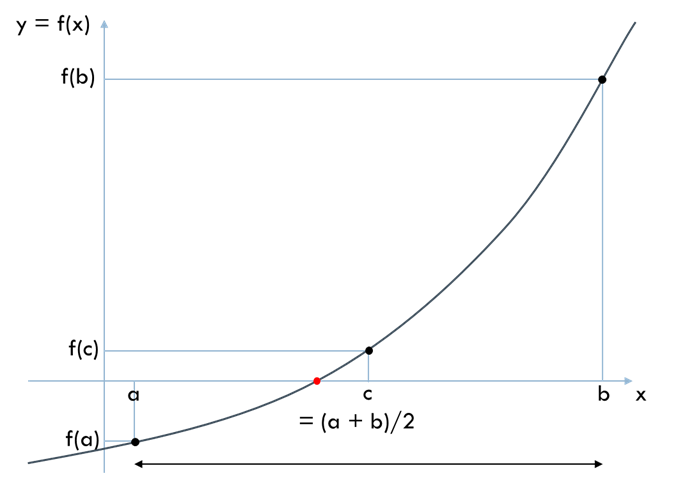 中点 \(c = (a + b)/2\) で関数値 \(f(c)\) を計算します.