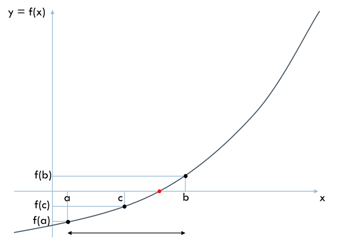 初期値として 2 つの点 \(a\) と \(b\) を与えます. それぞれにおける関数値は \(f(a)\) と \(f(b)\) です. 区間 \([a, b]\) には解が 1 つだけ入っていなければなりません. 従って, \(f(a)\) の符号 と \(f(b)\) の符号は反対でなければなりません.